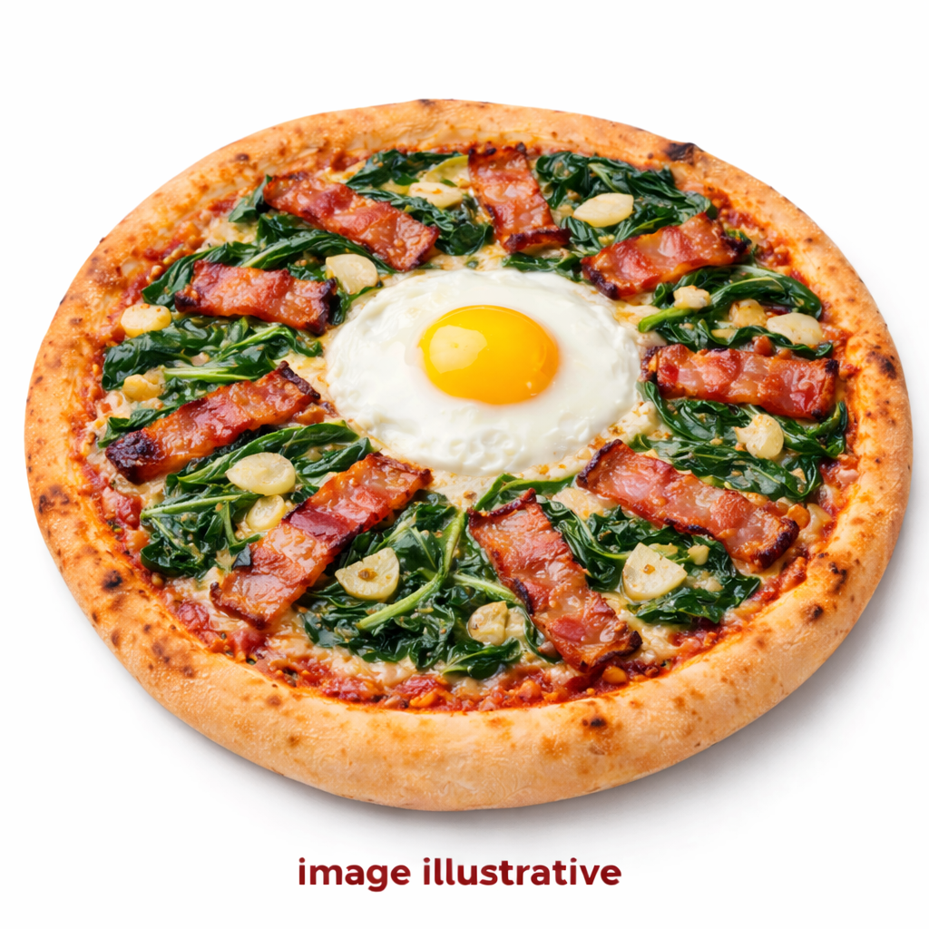 PizzasSauce Tommate, Mozarella, Épinards, Lard, Ail, Oeuf.