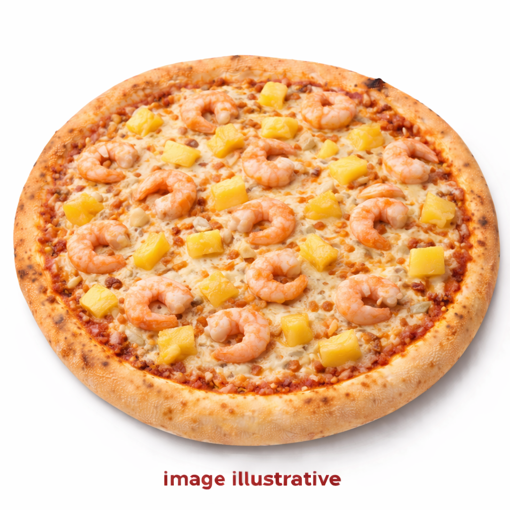 Évadez-vous dans les tropiques avec cette pizza exotique. Les crevettes juteuses s’allient à l’ananas sucré pour offrir une fusion de saveurs terre-mer inoubliable.