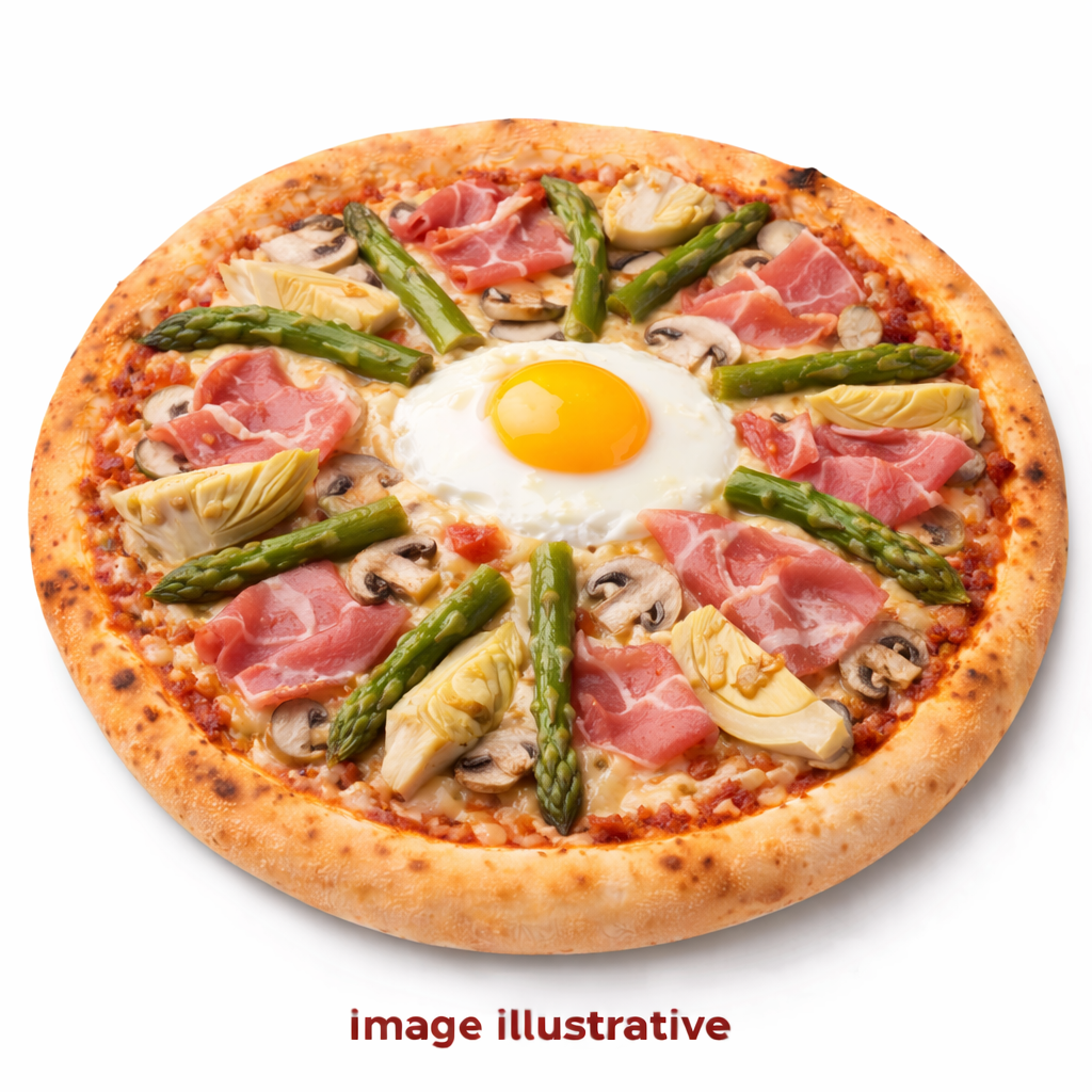 PizzasSauce tommate, mozarella, jambon, champignons, artichauts, asperges, oeuf.